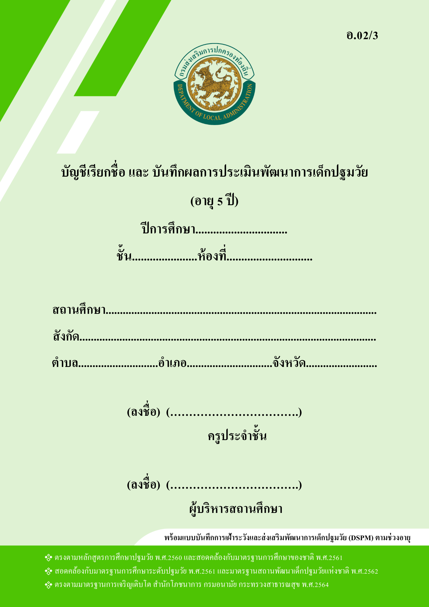 บัญชีเรียกชื่อและแบบบันทึกผลการประเมินพัฒนาการ (อ.02/3) อายุ 5 ปี ปกการ์ตูน สำหรับโรงเรียนอนุบาล (สพฐ และเอกชน)